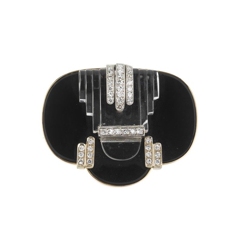 SPILLA IN ONICE E CRISTALLO DI ROCCA in oro giallo 18kt e platino, di forma geometrica, con base in onice su cui poggia un elemento in cristallo di rocca impreziosito da diamanti taglio vecchio e brillante per ct 1.20 circa, punzoni francesi dell'oro e platino, dim. cm 5x4 circa, gr. 31