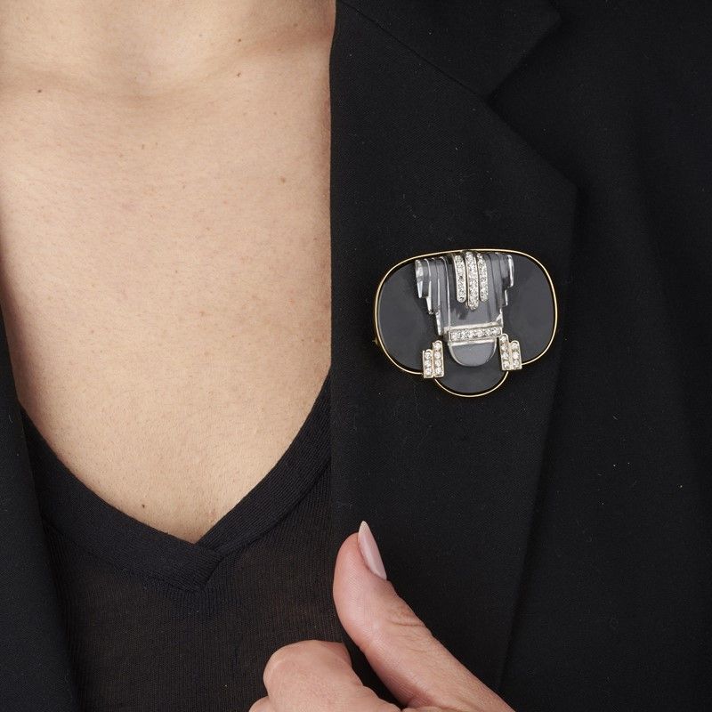 ONYX AND ROCK CRYSTAL BROOCH IN 18KT YELLOW GOLD AND PLATINUM