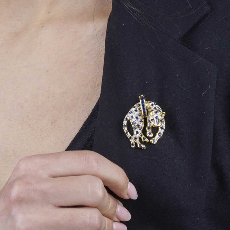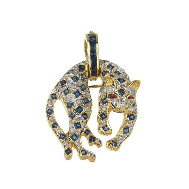 SPILLA/PENDENTE A FORMA DI PANTERA in oro giallo e bianco 18kt, impreziosita da zaffiri taglio carré per ct 2 circa e diamanti taglio brillante per ct 0.50 circa, punzoni 750 e del fabbricante, dim. cm 2,5x4 circa, gr. 12