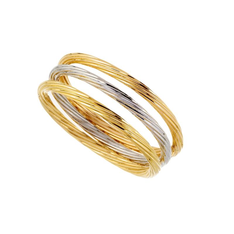in oro giallo, bianco e rosa 18kt, con superfici scanalate, punzoni 750 e del fabbricante, dim. cm 7x6 circa, diam. interno cm 6, gr. 59 complessivi