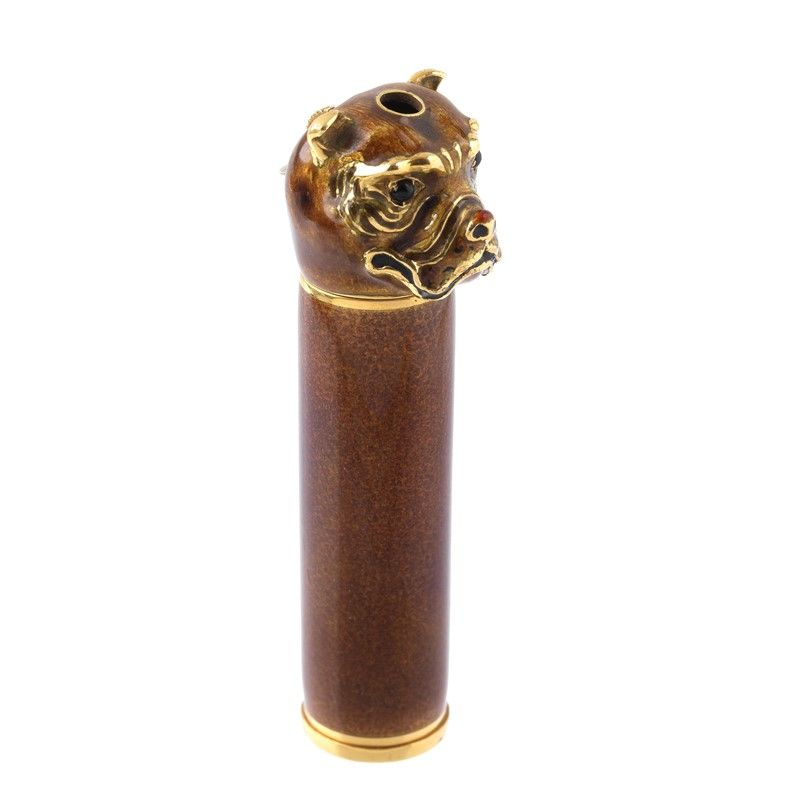 rivestito in oro giallo 18kt, punzone 750, fusto cilindrico decorato in smalto di marrone, estremità superiore a forma di testa di cane incisa con occhi in pietre cabochon marroni, dim. cm 8x2, gr. 74