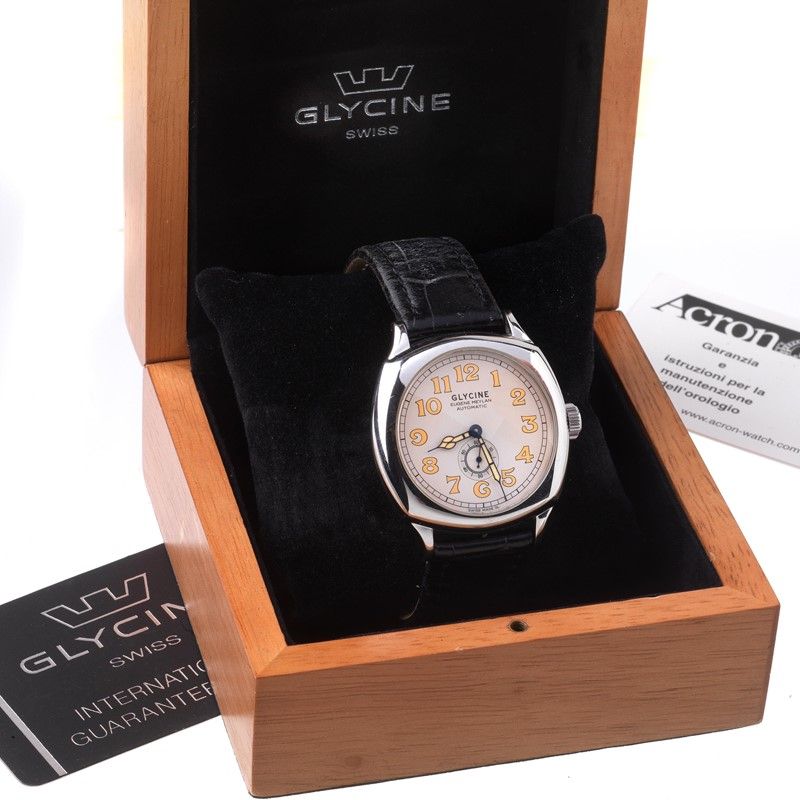 cassa di forma in acciaio, fondello con movimento a vista, corona marcata, lunetta in acciaio, quadrante panna, grafica nera, numeri arabi al superluminova, secondi a ore sei, movimento a carica automatica cal ETA 2895-2, cinturino originale in pelle nera, chiusura doppia deployant in acciaio marcata Glycine, vetro minerale. Dim. mm 41x50. Corredato di scatola e garanzia.