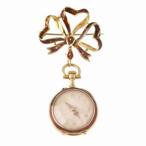 OROLOGIO DA DONNA CON SPILLA IN ORO E SMALTO cassa a cerniera in oro giallo 18k finemente decorata in smalto rosso, [..]