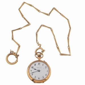 OROLOGIO DA TASCA IN ORO CON CATENA cassa in due parti in oro giallo 18kt, punzoni inglesi, fondello finemente [..]