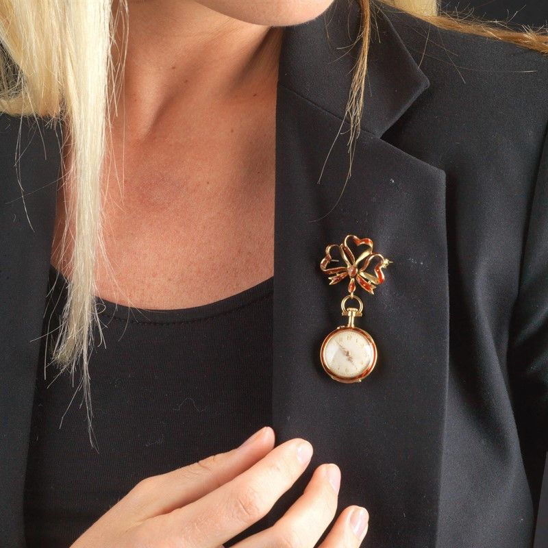 OROLOGIO DA DONNA CON SPILLA IN ORO E SMALTO cassa a cerniera in oro giallo 18k finemente decorata in smalto rosso, al centro raffigurazione oro con motivi floreali fogliacei decorata con piccole rose di diamante, lunetta decorata in smalto rosso, quadrante bianco opaco, numeri arabi color oro, lancette Luigi XV, movimento a carica manuale, spilla fermaglio in oro giallo 18kt a forma di fiocco decorata in smalto rosso, gr. complessivi 20. Diam. mm 24 Orologio non funzionante.