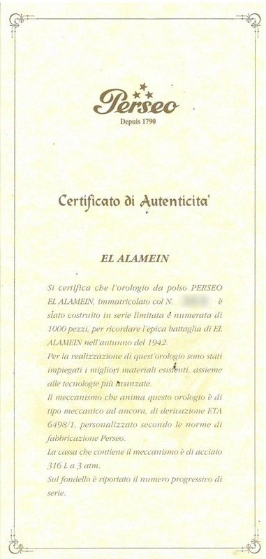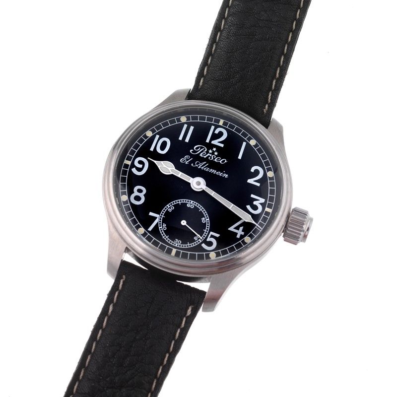 cassa in acciaio, fondello con movimento a vista, corona marcata, quadrante nero, grafica bianca, numeri arabi al superluminova, secondi a ore sei, movimento a carica manuale cal ETA 6498-1, cinturino originale in pelle nera, fibbia in acciaio con logo Perseo, vetro minerale. Diam. mm 47. Corredato di scatola, controscatola, certificato, bussola, coltellino multifunzione e catena portachiavi.