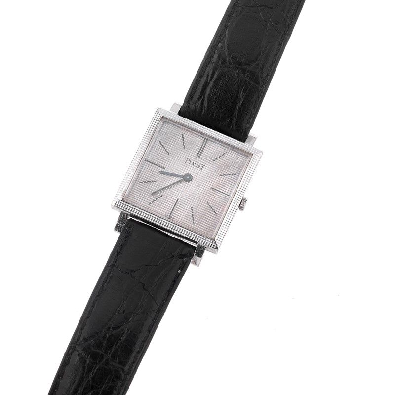 cassa quadrata in oro bianco 18kt, fondello serrato con viti, lunetta in oro bianco e quadrante tapisserie, grafica nera, indici stampati, movimento a carica manuale, cinturino non originale in pelle nera, fibbia in oro bianco 18kt marcata Piaget, vetro minerale, gr. 27. Dim. mm 25x34
