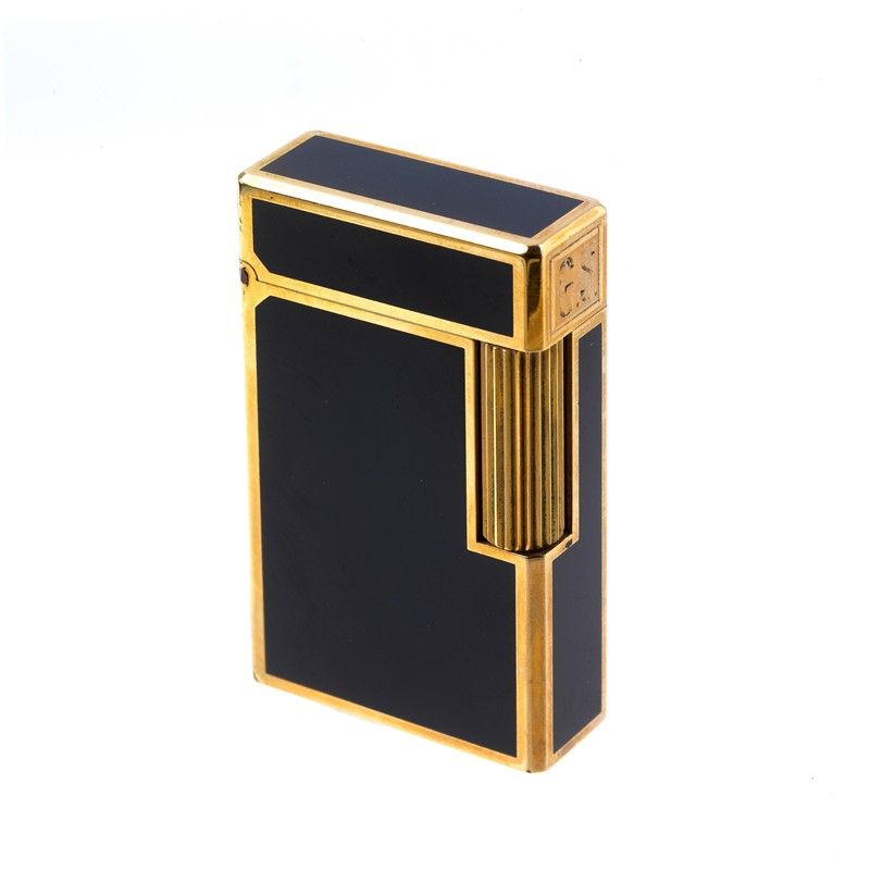 S.T. DUPONT ACCENDINO di forma rettangolare, decorato con nera e rifiniture in metallo dorato, recante personalizzazione in lettere "G.S." e due logogramma giapponesi su un lato, firmato "S.T.Dupont e "Made in France", dim. cm 3,50x5,5x1,50 circa, gr. 106. Corredato di scatola e garanzia. Accendino bloccato.