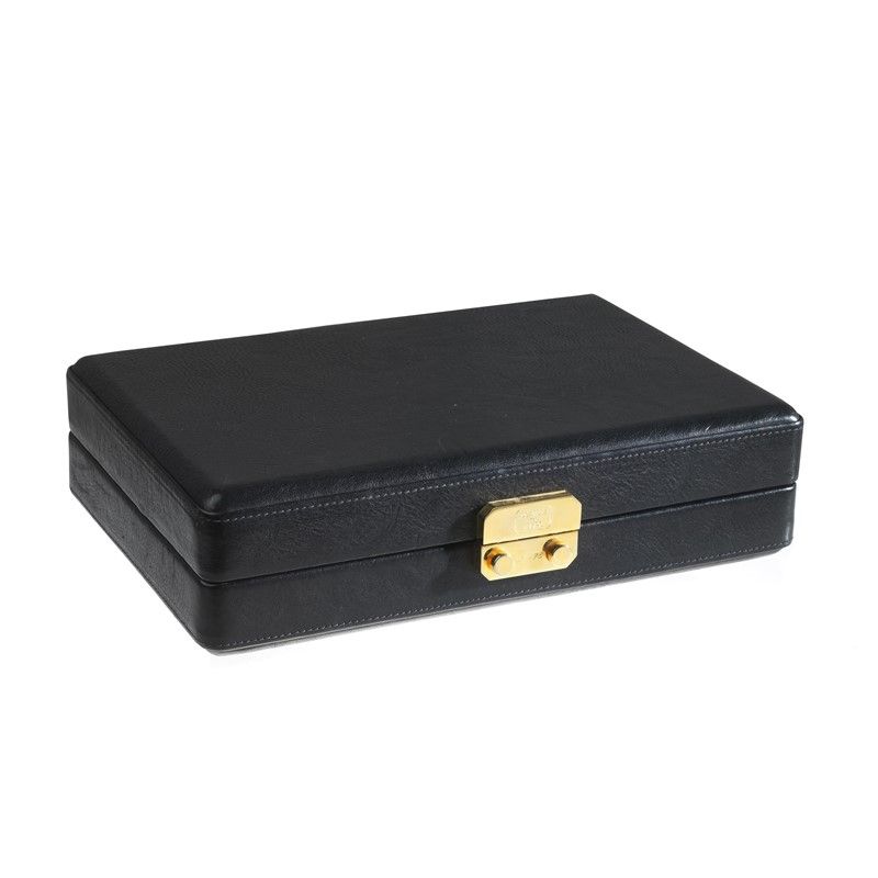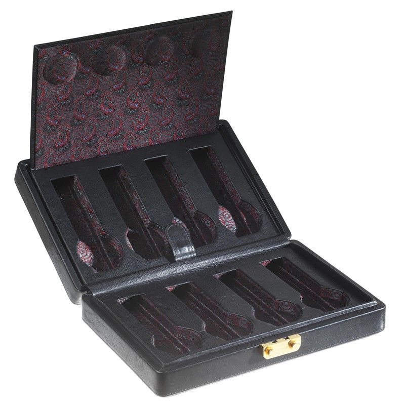 SCATOLA PORTA OROLOGI "SCATOLA DEL TEMPO" N. 778 in pelle nera, metalleria in ottone, apertura a valigetta con pulsante, a doppio scompartimento, rivestita internamente da tessuto fantasia cachemire sui toni del rosso, contenente 8 alloggi per orologi da polso. Dim. cm 26x17,5x6,5