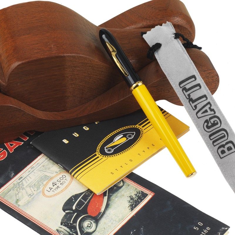 BUGATTI TYPE 50 PENNA STILOGRAFGICA EDIZIONE LIMITATA N. 0296/1930 fusto in brillante resina di colore giallo, cappuccio in resina nera, dettagli di rifinitura in metallo dorato, pennino in oro 18kt misura M, caricamento a stantuffo, lungh. cm 14. Corredata di scatola in legno a forma di auto, controscatola e garanzia.
