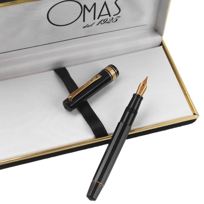fusto faccettato in resina nera, dettagli di finitura in metallo dorato, decorazione a motivo greco, firmata Omas 1930, pennino in oro 14kt, caricamento a stantuffo, lungh. cm 12. Corredata di scatola.