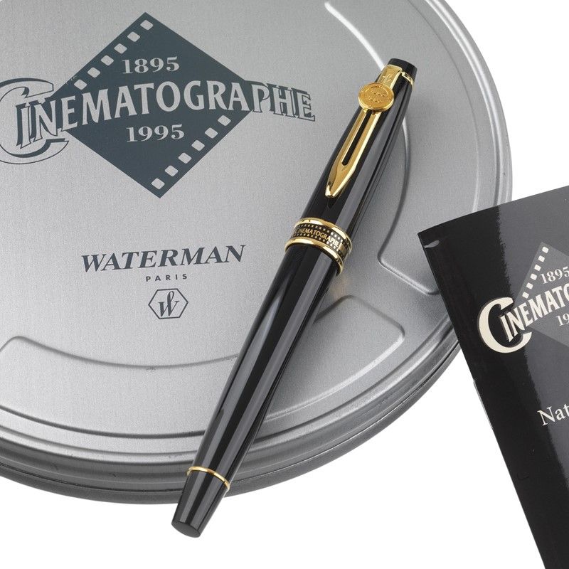 WATERMAN CINEMATOGRAPHE PENNA STILOGRAFICA EDIZIONE LIMITATA in resina nera, dettagli di rifinitura in metallo dorato, marchio Cinematographe alla base del cappuccio con simbolo della pellicola cinematografica e degli anni 1895-1995 sul fermaglio, pennino misura F, caricamento a stantuffo, realizzata per la commemorazione del centenario dalla nascita del cinematografo dei fratelli Lumière. Corredata di scatola a forma di contenitore per pellicole e garanzia.