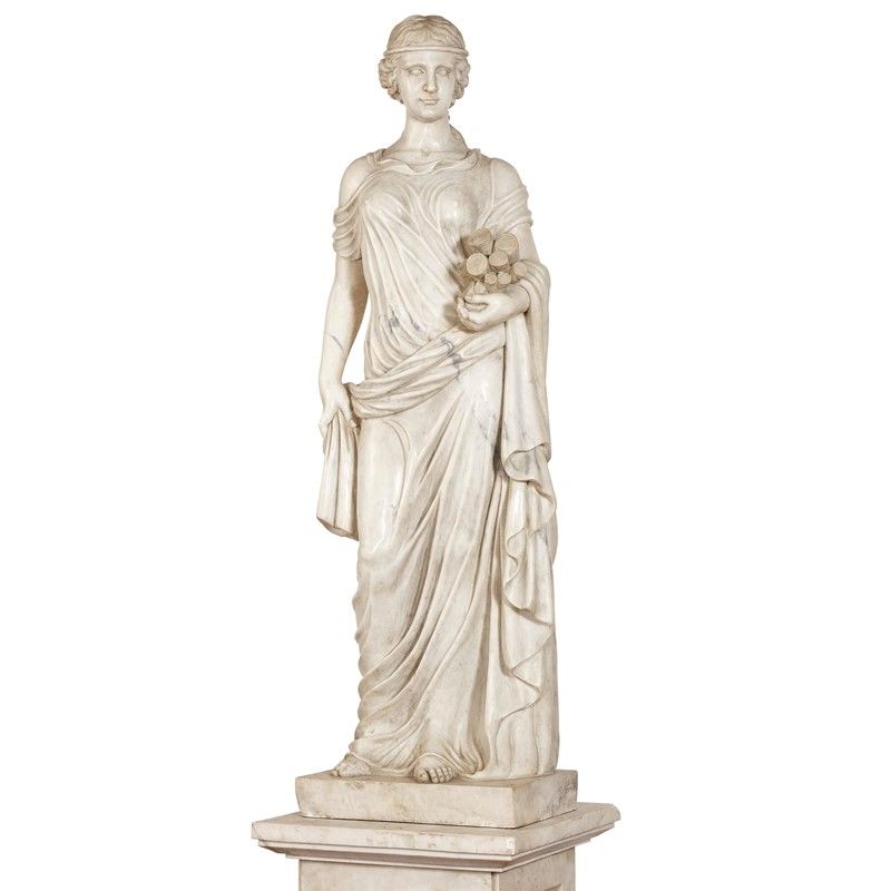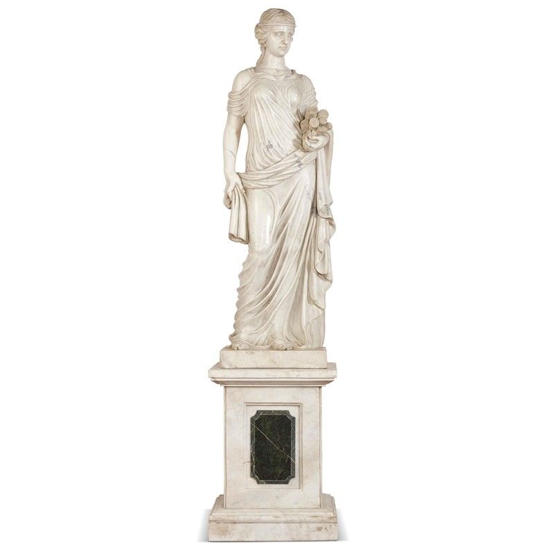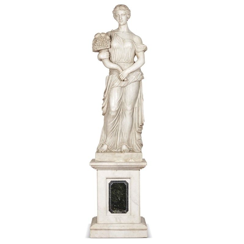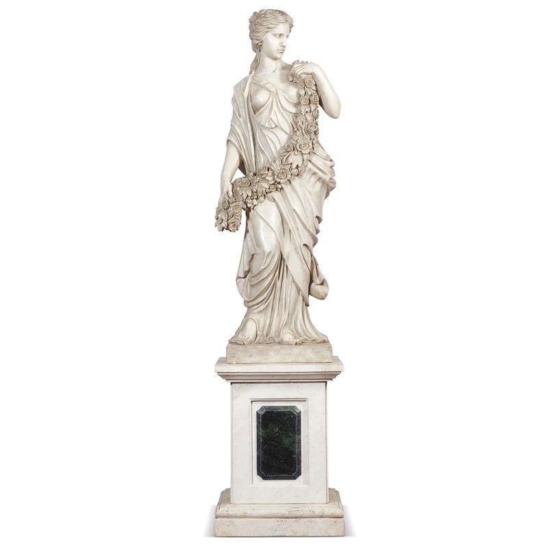(active in Rome, XX century) ALLEGORIES OF THE FOUR SEASONS four sculptures in white marble, dressed in the old fashioned way, on a white marble base with green marble tiles in the centres; three signed CM and one signed C Marzi 1936 on the base; alt. 170 cm, base 80,5 cm Questo lotto sarà visionabile previo appuntamento presso la nostra sede di Prato in Via Fratelli Giachetti 35. Per appuntamento scrivere a: fineart@pandolfini.it