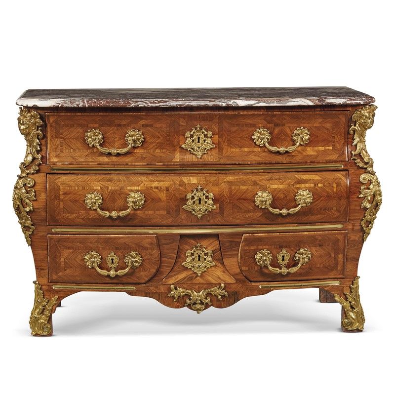 in legno lastronato, fianchi e fronte bombati, piano in marmo rosso con bordo a becco di civetta, montature in bronzo dorato in foggia di espagnolettes sugli angoli terminanti poi in ricchi sabots a volute, due cassetti con maniglie e bocchette in bronzo dorato sottesi da cassetto piccolo centrale incassato affiancato da due cassetti; cm alt 87x134,x65,5