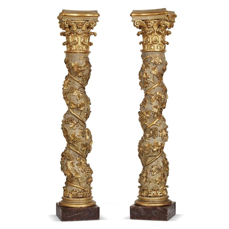 COPPIA DI COLONNE, ROMA, DI GUSTO SEICENTESCO in legno intagliato laccato e dorato, capitelli dorati scendono su colonne di forma tortile impreziosita da decoro dorato con uva e a foglie di vite che sale da intaglio a foglie aperte, su base in legno; alt. cm 218