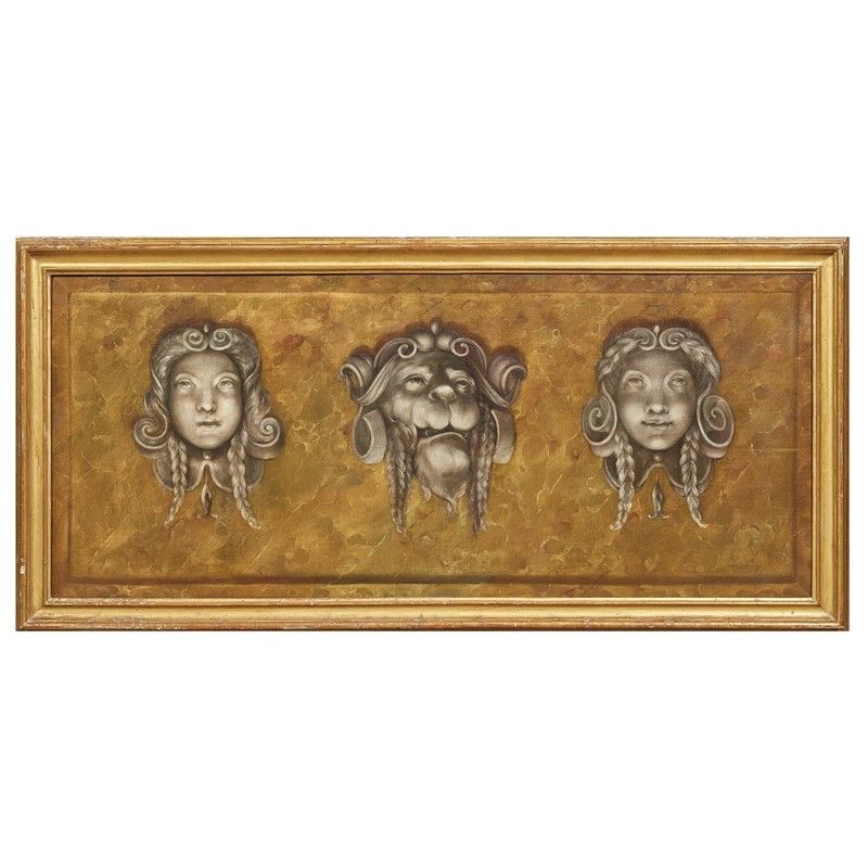 dipinti ad olio su tela, raffiguranti tre mascheroni ciascuno, entro cornice in legno intagliato e dorato; cm 82x194