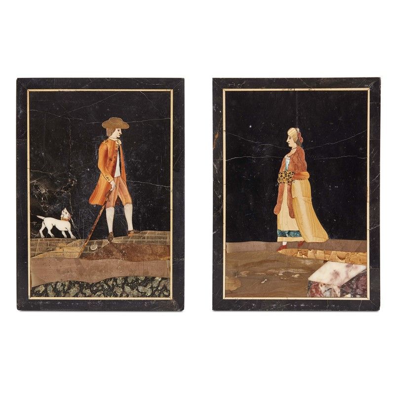 in pietre dure, marmo nero del Belgio e verde antico, raffiguranti personaggi di patriziato; cm 13,2x18,2