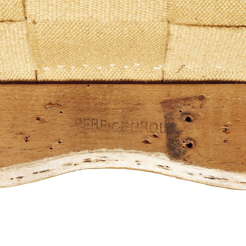 in legno di faggio, stampigliata due volte PERE GOURDIN, lo schienale di linea mossa terminante in modo avvolgente in entrambe le estremità, di cui una più estesa, il cuscino e lo schienale rivestiti in seta, gambe mosse terminanti a ricciolo; cm 92,5x195x75