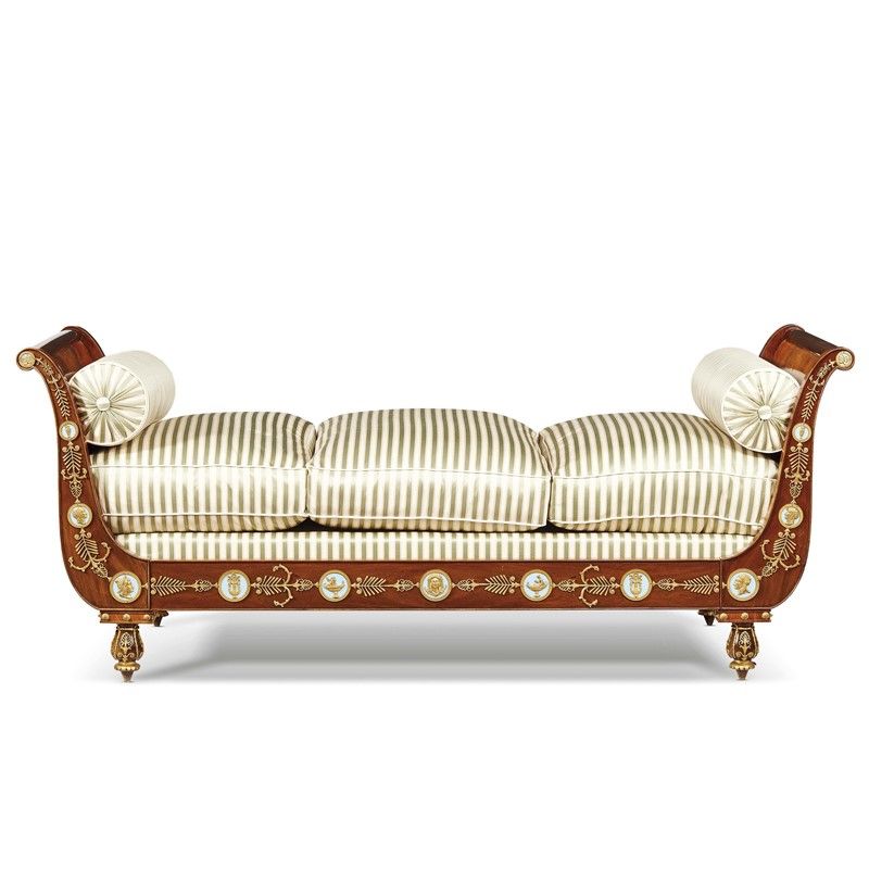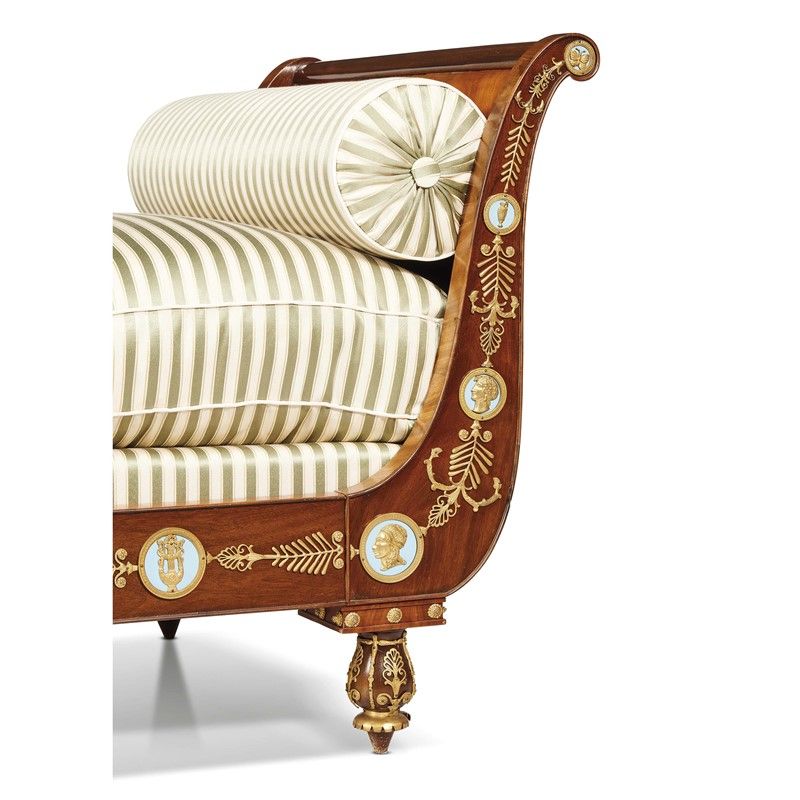 in legno di mogano, presenta su un lato applicazioni in bronzo dorato e placchette in smalto e bronzo dorato, con cuscini rivestiti in seta a righe bianche e verdi; cm 91x222x91