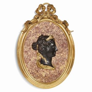 COPPIA DI RILIEVI, ROMA, SECOLO XIX in bronzo patinato e dorato, montati su marmo entro cornice dorata, raffiguranti [..]