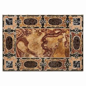 PIANO DI TAVOLO, MANIFATTURA ROMANA, FINE SECOLO XVI in marmo bianco intarsiato in pietre policrome. Di forma [..]
