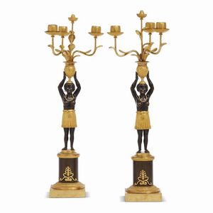 COPPIA DI CANDELABRI, PARIGI, 1800-1810 Girandoles au jeune Africain In bronzo dorato e patinato; alt. cm 56,5 [..]