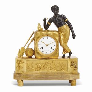 OROLOGIO DA CAMINO, PARIGI, 1807-1815 Le Savoyard antillais, ou Le Porteur de balle de coton in bronzo dorato [..]