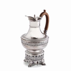 CAFFETTIERA CON FORNELLINO, PAUL STORR, LONDRA, 1810 in argento sbalzato e cesellato, manico in legno intagliato, [..]