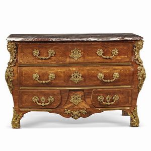 COMMODE, FRANCIA, SECOLO XVIII in legno lastronato, fianchi e fronte bombati, piano in marmo rosso con bordo a [..]