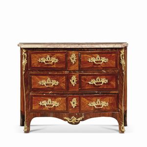 COMMODE, FRANCIA, METÀ SECOLO XVIII in legno intarsiato e piano in marmo, sotteso da fronte di linea mossa [..]