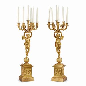 COPPIA DI CANDELABRI, FRANCIA, SECOLO XIX in bronzo dorato, a sei luci con candele, raffiguranti amorino che sorregge [..]