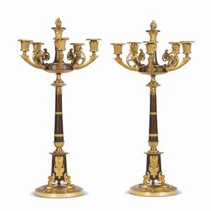 COPPIA DI CANDELABRI, FRANCIA, PRIMA METÀ SECOLO XIX in bronzo brunito e dorato, fusto a colonna su base [..]