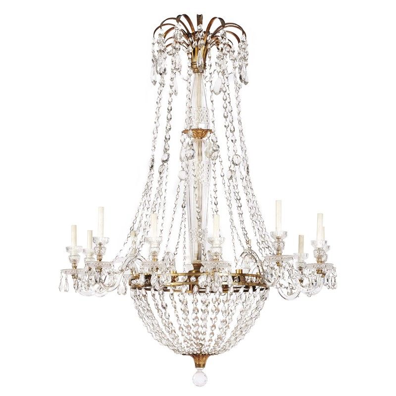 LAMPADARIO, FRANCIA, SECOLO XIX in cristallo, cima a petali ricurvi in bronzo dai quali discendono pendagli e collane di cristalli, corpo centrale a due elementi regge palco circolare dal quale si dipartono dodici luci su bracci a doppia voluta, termina con fili di gocce di cristallo riunite al centro da sfera; cm 152x115