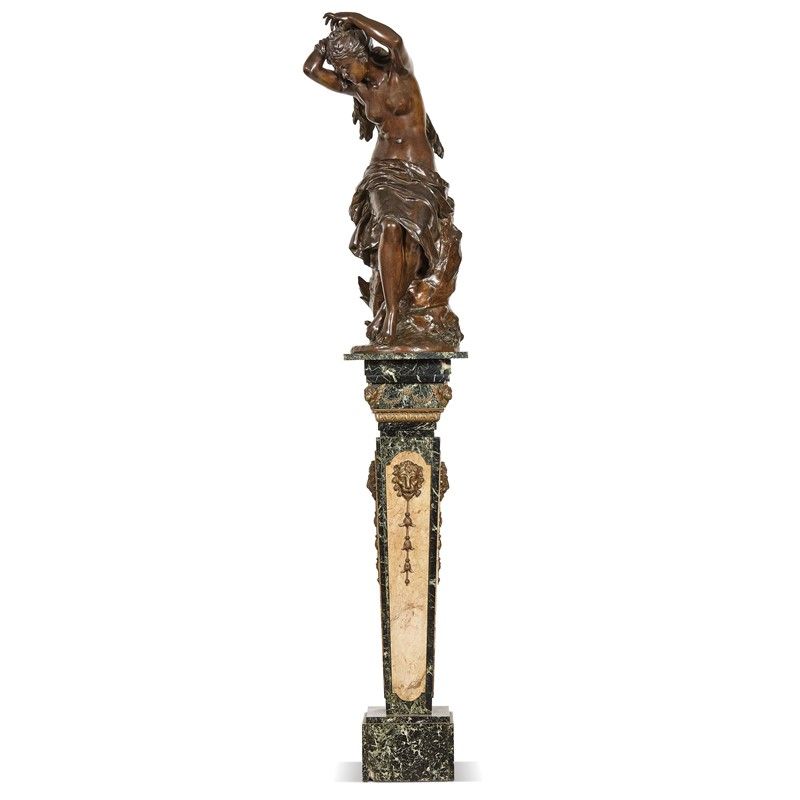 Mathurin Moreau (1822-1912) GIOVANE DONNA bronzo, su colonna, in basso a sinistra firma e iscrizione Moreau. Mat. / Hors. concourse e timbro MEDAILLE D'HONNEUR; cm 89x29x29, colonna cm 110,5x32x32
