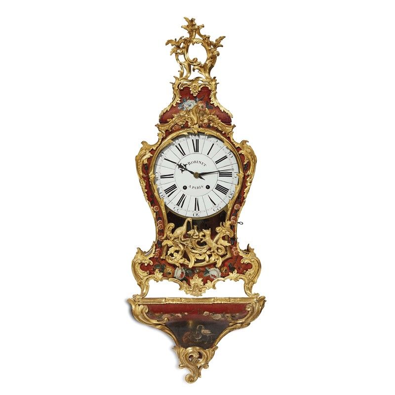 in legno dipinto a fondo rosso e fiori, ricca decorazione in bronzo dorato raffigurante la favola della volpe e l’uva, dipinta anche sulla mensola. Quadrante in smalto bianco con numerazione in numeri romani, firmato Robinet à Paris; cm 96x44,5x23 completo di mensola, cm 28,5x44x23