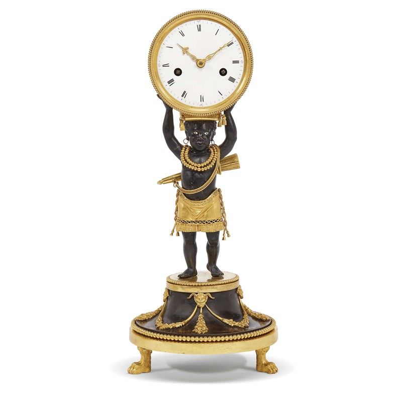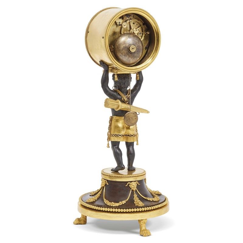 Su di una base troncoconica ornata da fregi a rilievo e sorretta da tre zampe ferine si erge la figura di un giovane “poratore” nero, vestito di un prezioso gonnellino con faretra a tracolla e una doppia collana di perle, intento a sorreggere su di un cuscino posto sul capo il quadrante dell’orologio. Anche in questo caso l’assegnazione del modello a Deverberie è confermata dalla figura del giovane, già utilizzata in altre composizioni.