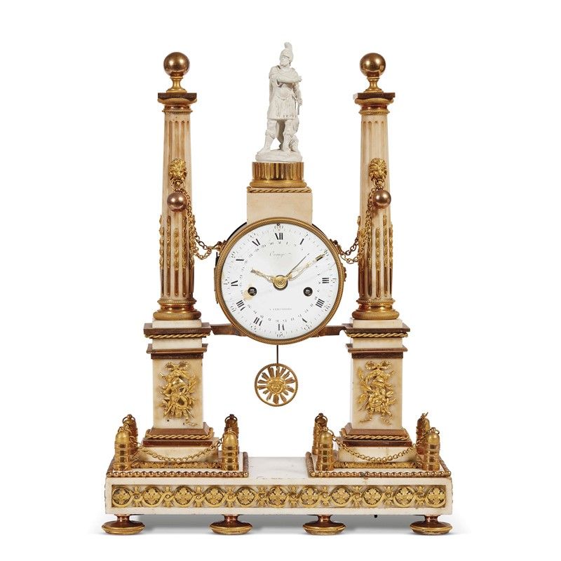 OROLOGIO DA CAMINO, FRANCIA, SECOLO XIX in marmo, bronzo dorato e metallo dorato, composto cassa rotonda sormontata da figura in biscuit con pendolo in forma di sole dorato, sul quadrante reca la firma Orange à Versailles, entro coppia di obelischi terminanti con pinnacolo a sfera e presentanti protomi leonine ed elementi dorati lungo la superficie scanalata su basamento con panoplie, la base in marmo con fregio in bronzo dorato a girali vegetali su otto piedi a trottola; completo di chiave; cm 57x40x17