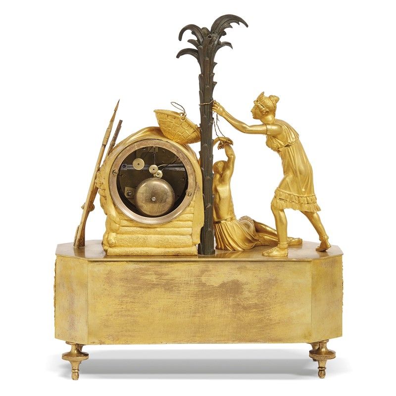La base a forma di parallelepipedo scantonato agli angoli si regge su quattro piedini a trottola, ornata da fregi sui lati corti e da un grande rilievo sul fronte raffigurante il funerale di Atala. Sopra di essa si svolge la scena con figure a tutto tondo, dove Atala è impegnata a liberare Chactas, legato ad una palma e appoggiato ad una catasta di legna dove è inserito il quadrante. Lo stesso soggetto si ripete in un altro modello di orologio leggermente più grande, di cui un esemplare è presente in questa collezione, dove sul lato opposto ad Atala è raffigurato un soldato di guardia addormentato, sostituito invece nella presente versione da un fucile e un moschetto. Rispetto alla maggior parte delle versioni note, questo orologio si distingue per la figura di Chactas, qui completamente dorata diversamente dal solito quando è rappresentato con la pelle scura, e per la palma, di solito dorata e qui invece patinata.