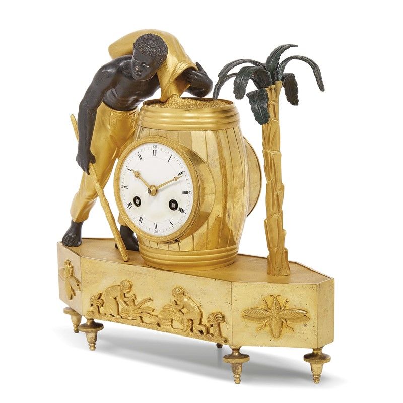 Su una base di forma sagomata, decorata da fregi a rilievo, è posto un giovane schiavo di colore intento a versare un sacco di caffè in una botte, nella quale è inserito il quadrante, probabilmente destinata all’imbarco su una nave, con accanto una piccola palma.