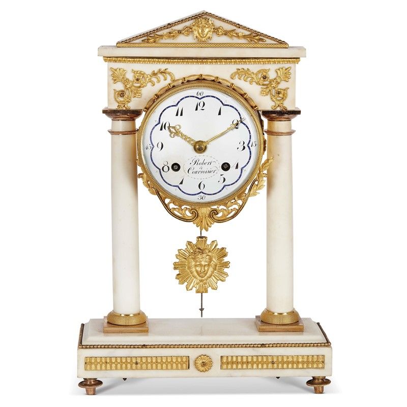 OROLOGIO DA CAMINO, SVIZZERA, INIZIO SECOLO XIX in marmo bianco e bronzo dorato, di forma architettonica poggiante su base parallelepipeda sormontata da due colonne e timpano con applicazioni in bronzo dorato, il quadrante della cassa centrale è firmato “Robert & Courvoisier”; cm 35x24x9
