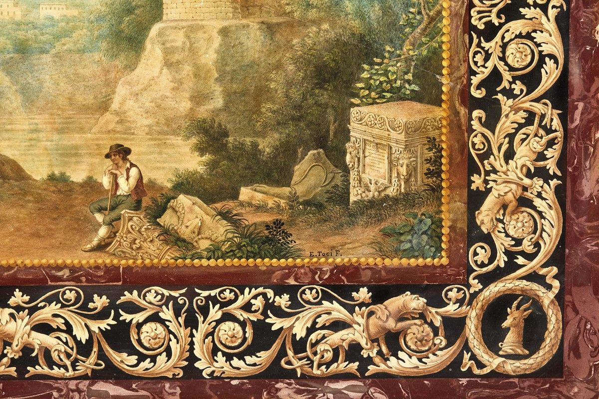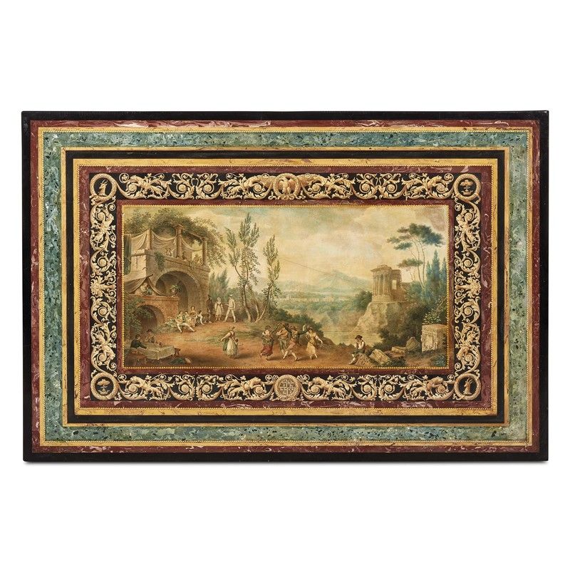 in scagliola policroma raffigurante al centro scena arcadica con festa paesana e rovine classiche. Il piano si struttura in più ordini di cornici dipinte ad imitare il marmo e bordure perlinate nei toni dell’oro. Un’elegante profilatura a volute che con pantere addorsate entro girali fogliacei e fiori incornicia poi il centro del piano, raffigurante alcuni personaggi che danzano, ed altri intenti a suonare e banchettare. Fra di essi, una maschera della commedia dell’Arte napoletana, quella di Pulcinella. A destra, un elemento architettonico, probabilmente la base della colonna sul cui capitello siede uno dei personaggi, riporta l'iscrizione DI[I]S MANIBU[S] ("Agli Dei Mani"). La bordura presenta inoltre lo stemma nobiliare della famiglia Hamilton, raffigurante al centro basso tre caprioli sottesi dal cartiglio con il motto “invia vertute pervia” e sui cantoni un albero che viene tagliato alternato a protomi di capriolo, cm 136x91,2; montato su tavolino del XIX secolo, cm 49,5x145x101