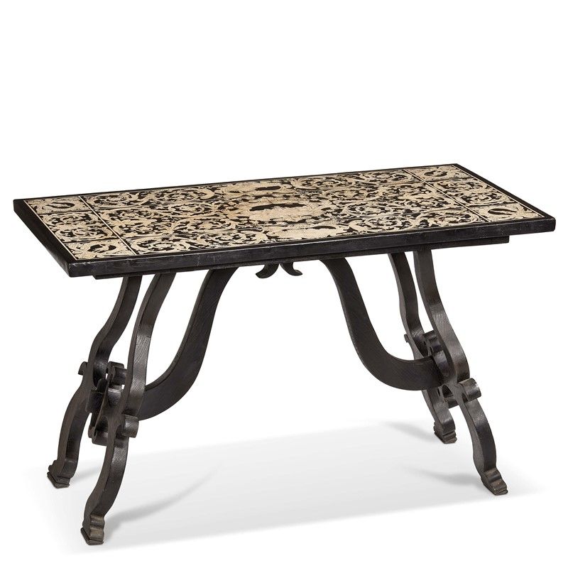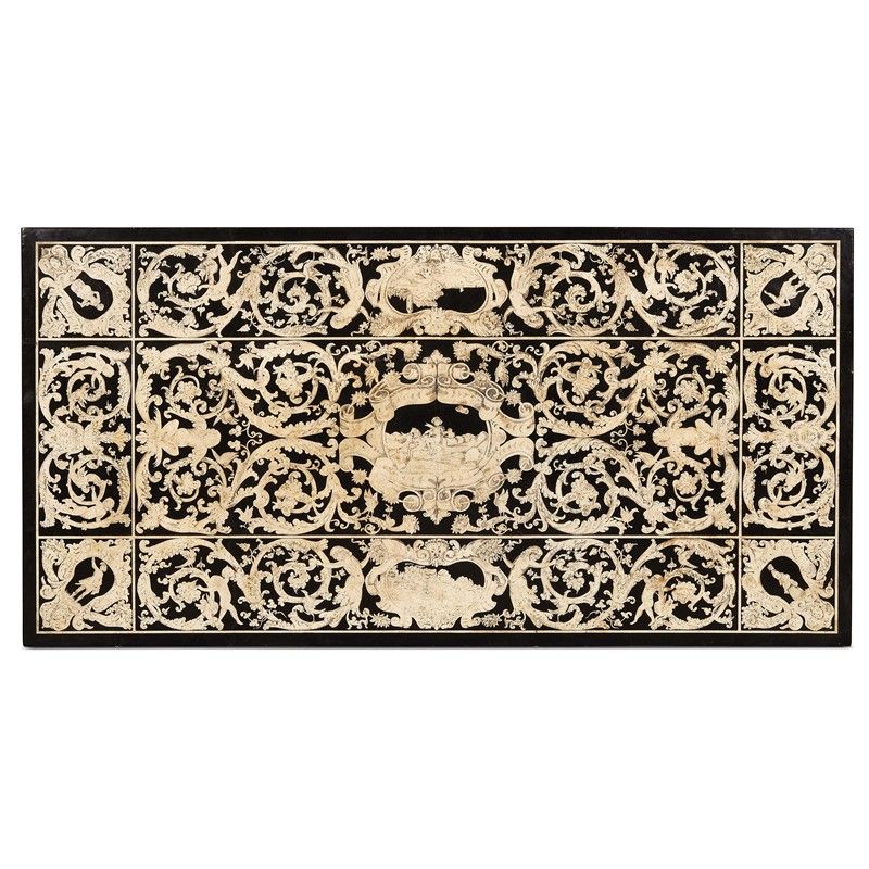 in bicromia netro-bianca, interamente decorato a girali fogliacei e suddiviso in sezioni che vedono al centro cartouche con cavaliere, i centri laterali ornati da girali fogliacei con mascherone e paesaggi ed i cantoni con fanciulle e spadaccini anch'essi entro cartouches, su tavolo con gambe e traverse a lira; cm 79x128x65