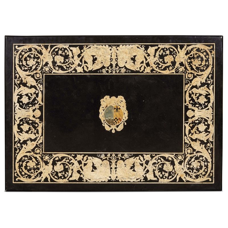 in scagliola policroma con stemma centrale e fregio di contorno con ricco intreccio di giroli fogliacei con personagg, putti, uccelli e fiori, raffiguranti ai centri superiore ed inferiore coppia di leoni alati affrontati e centrati da candelabra, ai centri laterali divinità marine bicaudate con cartiglio, ed affrontati su sostegno centrale anche'esso in scagliola in foggia di balaustro su base modanata; cm 83x111x80