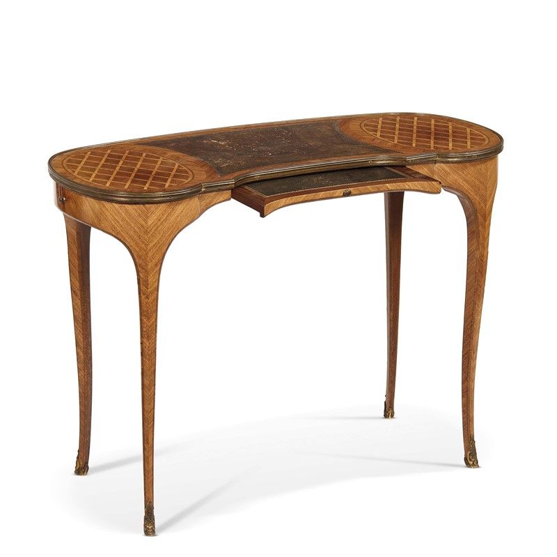 in legno lastronato, piano parzialmente rivestito in cuoio, sotteso da un piano scrittorio estraibile centrale e due cassetti laterali, su quattro esili gambe desinenti in sabots in bronzo dorato, stampigliato G. Durand nella parte sottostante; cm alt. cm 72x99,5,x40