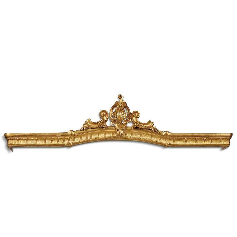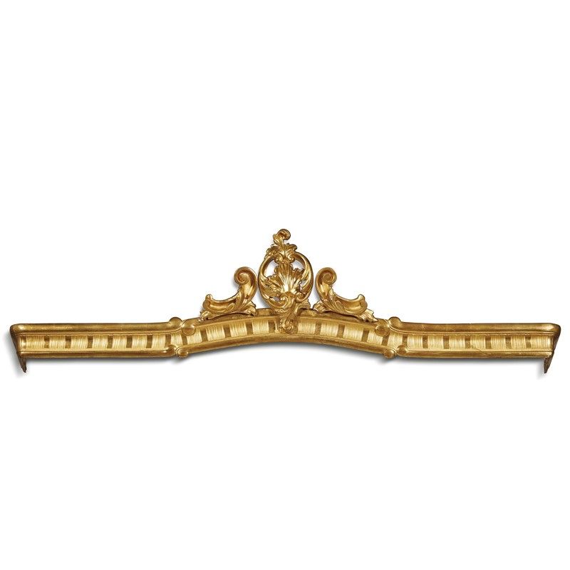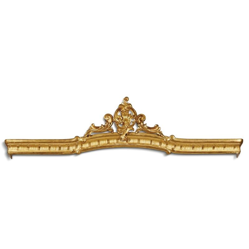 SEI MANTOVANE, ITALIA MERIDIONALE, SECOLO XIX in legno dorato e intagliato, fascia incisa a fogliette stilizzate entro cornice a lunghe volute ricorrenti, cimasa a giorno scolpita a volute a ricciolo poste a inquadrare motivo rocaille a foglia aperta; cm 38x168x24 (4), cm 38x168x38 (2)