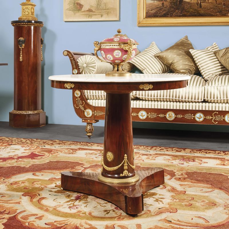 TAVOLINO DA CENTRO, FRANCIA, SECOLO XIX in legno di mogano, piano circolare in marmo bianco sotteso da fascia impreziosita da applicazioni in bronzo dorato a medaglione entro doppia palmetta, riposante su gamba troncoconica con applicazioni din bronzo dorato in foggia di sole dorato e torciere con festoni, su base sagomata; alt. cm 69, diam. cm 79