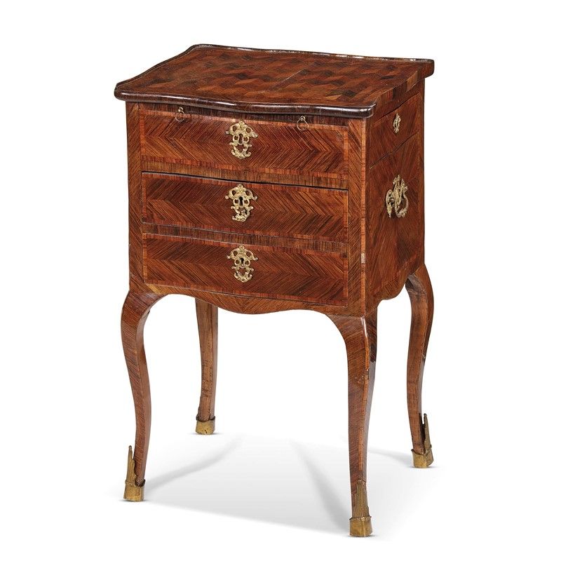 lastronato in legni vari, con bocchette in bronzo dorato, presenta gambe di linea mossa terminanti in sabots in bronzo dorato; cm 76x46x36