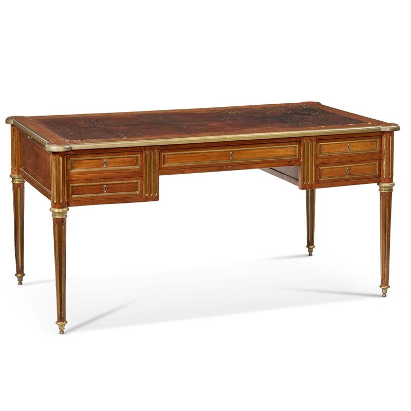 in mogano, piano di linea ondulata parzialmente ricoperto in cuoio, profilato in ottone, 4 cassetti laterali e uno più largo sotto il piano; alt cm 76, lungh cm 152, largh. cm 84,5