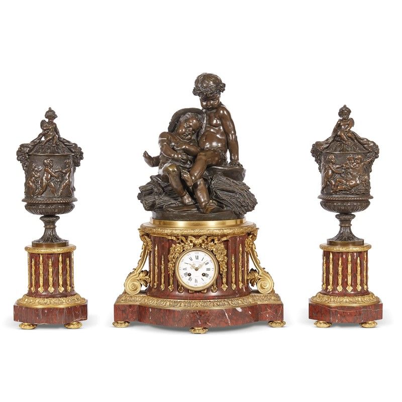 in bronzo brunito, dorato e marmo rouge griotte, composto da orologio e due vasi, l'orologio con quadrante firmato Delafontaine Ft De Bronzes A Paris, presenta gruppo in bronzo con putti su cassa a tamburo scanalata ed impreziosita da applicazioni di gusto rocaille in bronzo dorato su piedi a sfera schiacciata, i due vasi presentano decoro con amorino sul coperchio e fascia con putti danzanti, su base scanalate con applicazioni in bronzo dorato e piedi a sfera schiacciata; cm 68 (orologio) per cm 58 (i vasi)