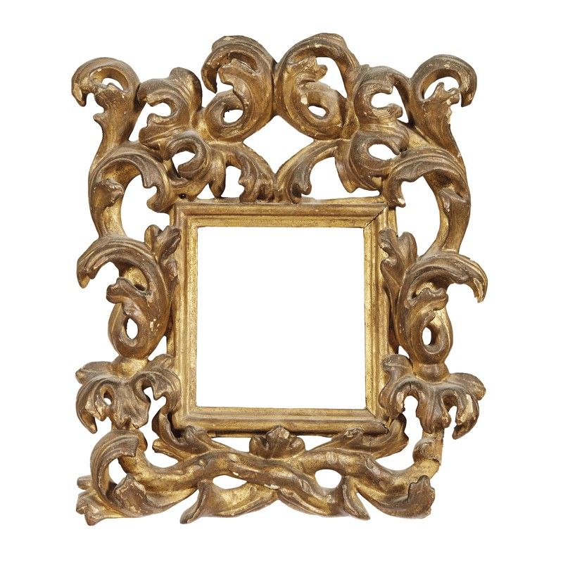 in legno intagliato e dorato, battuta a gola si porta su più ordini di piccole modanature terminati in fascia interamente contornata da intaglio a giorno di volute riunito alla base da cornucopie incrociate sotto foglie aperte; ingombro cm 33,5x28,8, luce cm 11,6x11,4